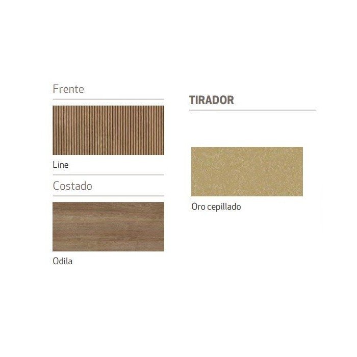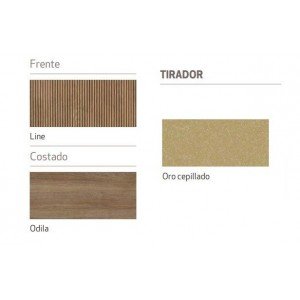 Para los frentes hemos utilizado la melamina denominada LINE, con un diseño de líneas rectas verticales, que aporta estructura y orden, y para sus costados el acabado ODILA, que armoniza su diseño.