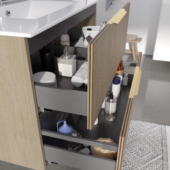 Disponen de regulación en altura y lateral, situada en el interior del cajón para facilitar el ajuste cuando el mueble quede pegado a una pared. Gracias al sistema de sus varillas también se puede regular la inclinación del frente del cajón inferior.