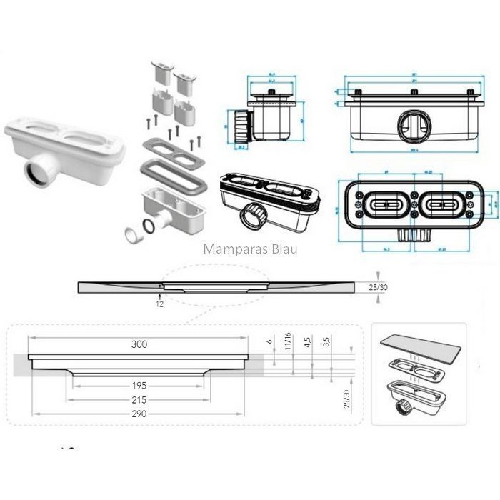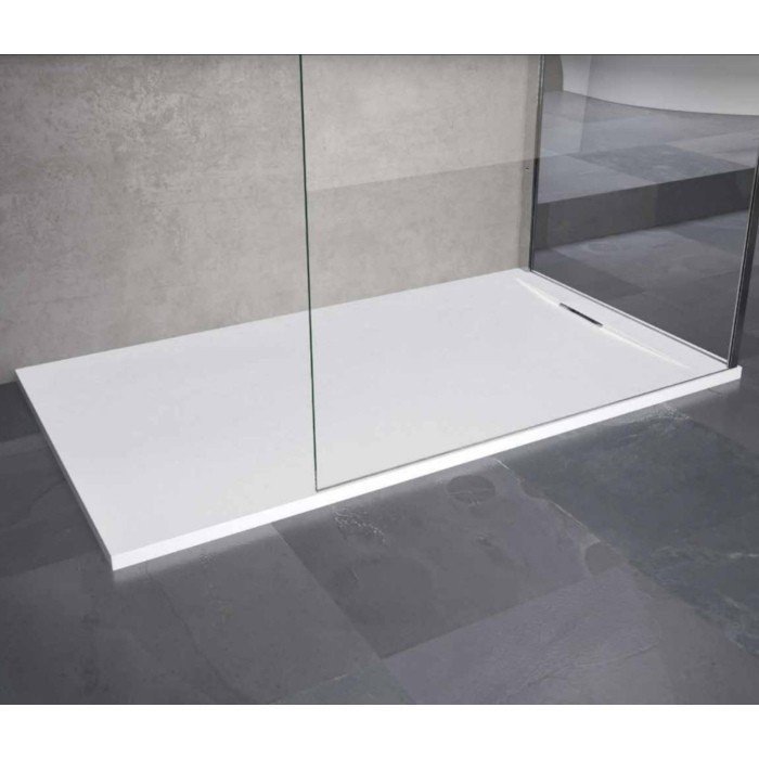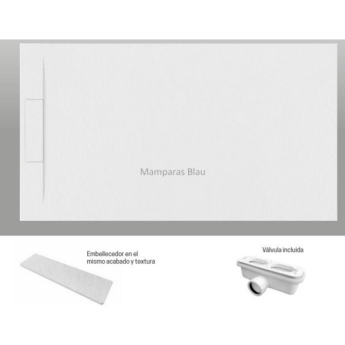 Modelo: Piatto Design. Medidas: Desde 100 x 70 hasta 200 x 90 cm. Grosor: 3 cm. Material: De resina con carga mineral. Limpieza: De fácil limpieza. Antideslizante: Clase 3. Textura: Pizarra. Rejilla: Incluida de resina. Colores: Blanco. Válvula: Incluida.