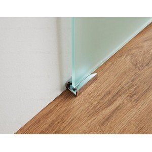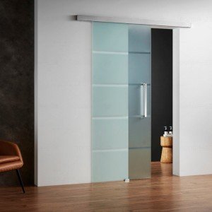 Puerta de paso para vivienda corredera, en vidrio serigrafiado de 8 mm, en aluminio cromo, completa con guías.