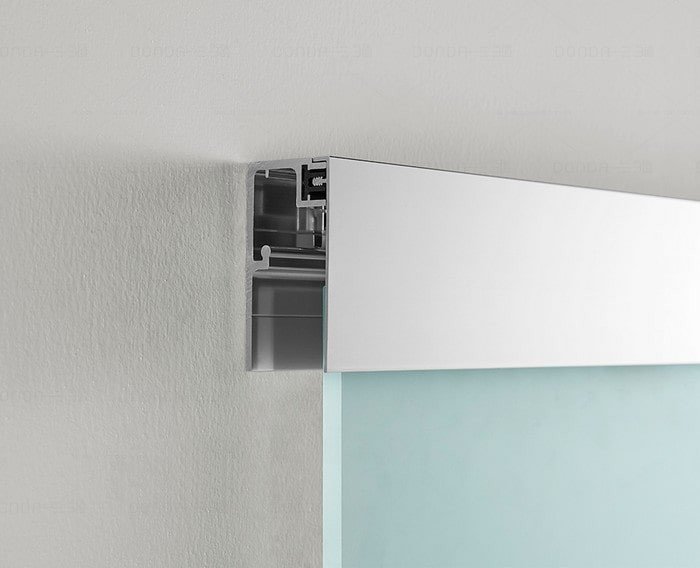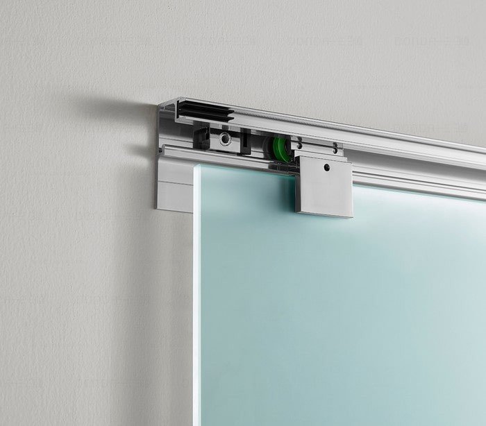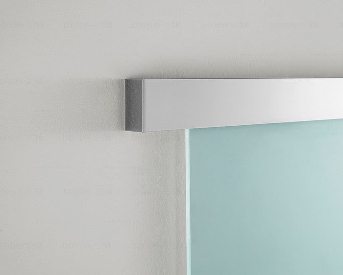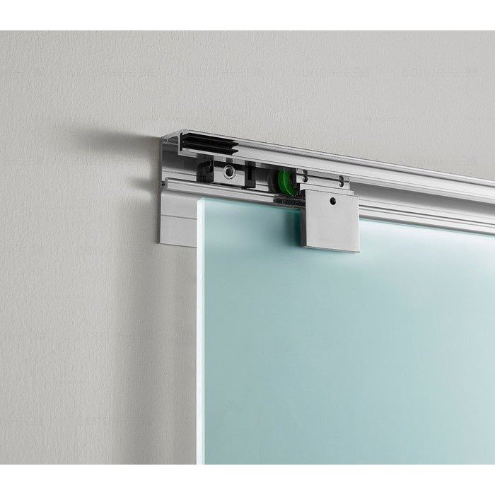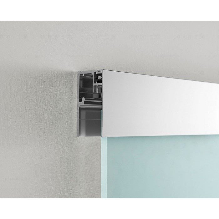 Posicionamiento a pared con sistema que ocultan totalmente las mordazas y mecanismos de la puerta. Las mordazas llevan doble rodamiento que garantizan un perfecto deslizamiento y suavidad en el movimiento de la puerta corredera, tanto la caja, el tirador de asa doble como el guiador inferior. La guía superior se suministrara con un ancho al doble del de la puerta (permite corte en obra) si fuera necesario.